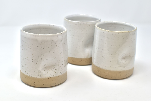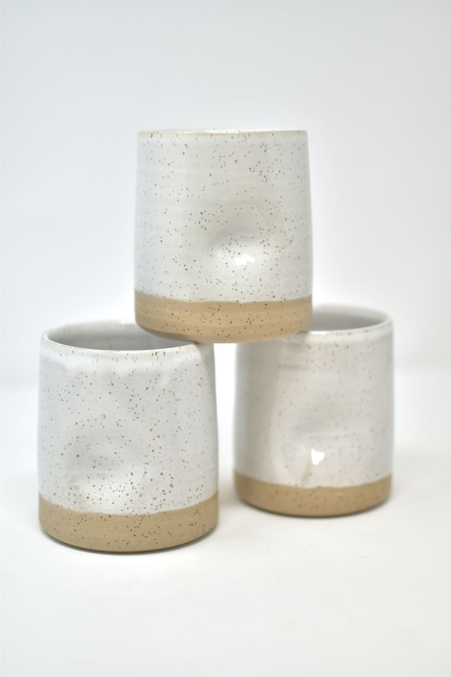 These tumblers are designed with tactility in mind, combining a classic shape with a modern twist of thumbprint dimples and finished with our milky white glossy glaze.